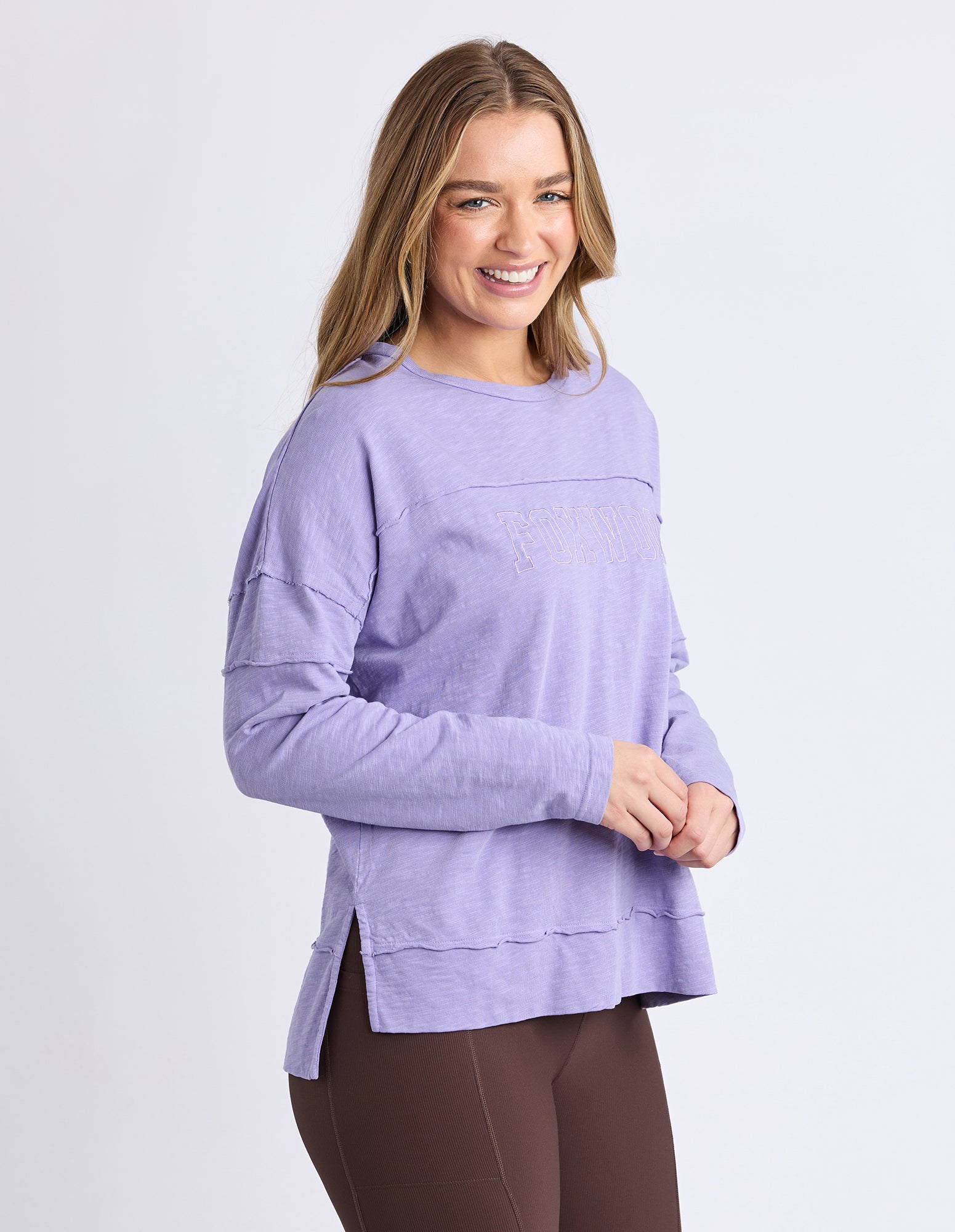 Stylish and easy to layer or wear by itself, the Throw On Long Sleeve Tee features a chest seam and raw edge details along with an exclusive front chest embroidery.