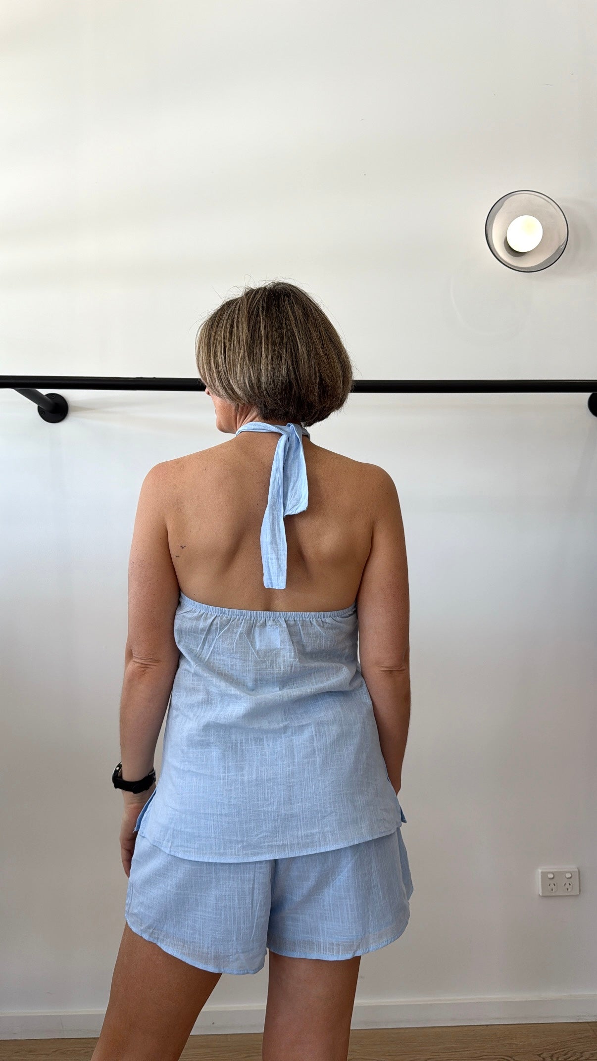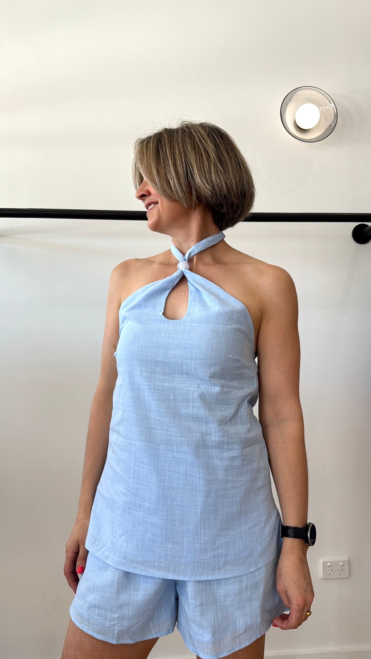 Halther tie top with beading detail + matching shorts.