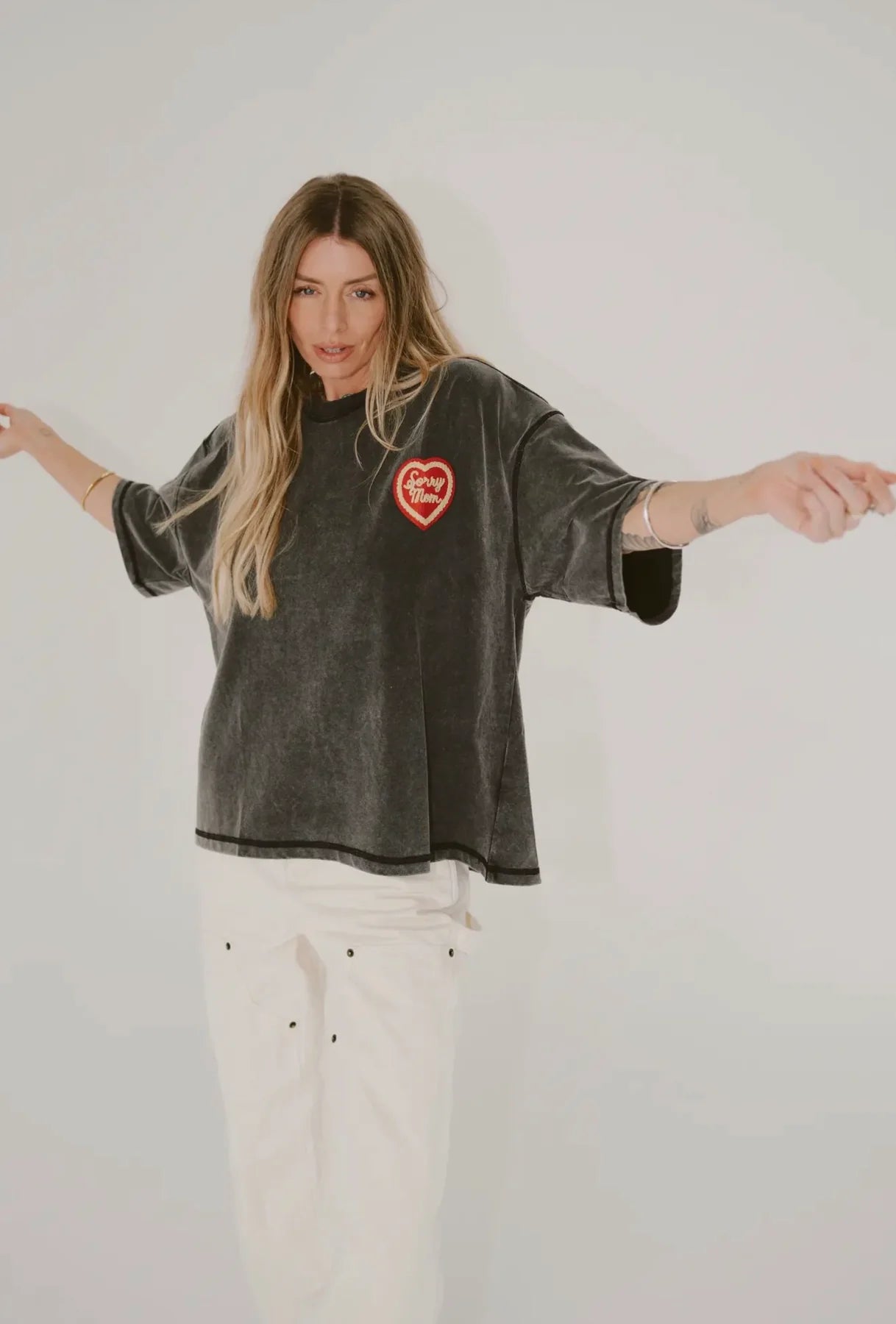 Sorry Mom Tee A love letter, a confession, and a badge of honor — all in one tee. The Sorry Mom Tee features a heart-felt “Sorry Mom” chain-stitched patch on the left chest, honoring every Happy Little Mother who’s held  it down. The back makes a statement with “No Mothers Left Behind” and a large HLM felt patch — bold, unapologetic, and stitched with intention. Made from 100% cotton. Our black tee is perfectly vintage-washed. While the white tee is for your everyday basic grab and go. This tee has a relaxed drop shoulder and a slightly cropped fit for that perfectly worn-in feel. Every patch is chain-stitched embroidered, giving it texture, depth, and that handmade energy we love.